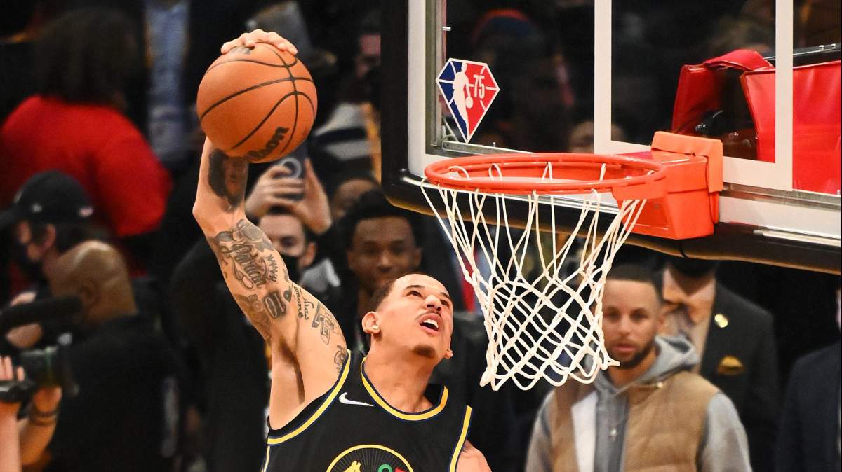 Getty/Tim NwachukwuJuan Toscano-Anderson, of the Golden State Warriors, dunks over teammate Andrew Wiggins during the Slam Dunk Contest of the 2022 NBA All-Star Weekend in Cleveland.