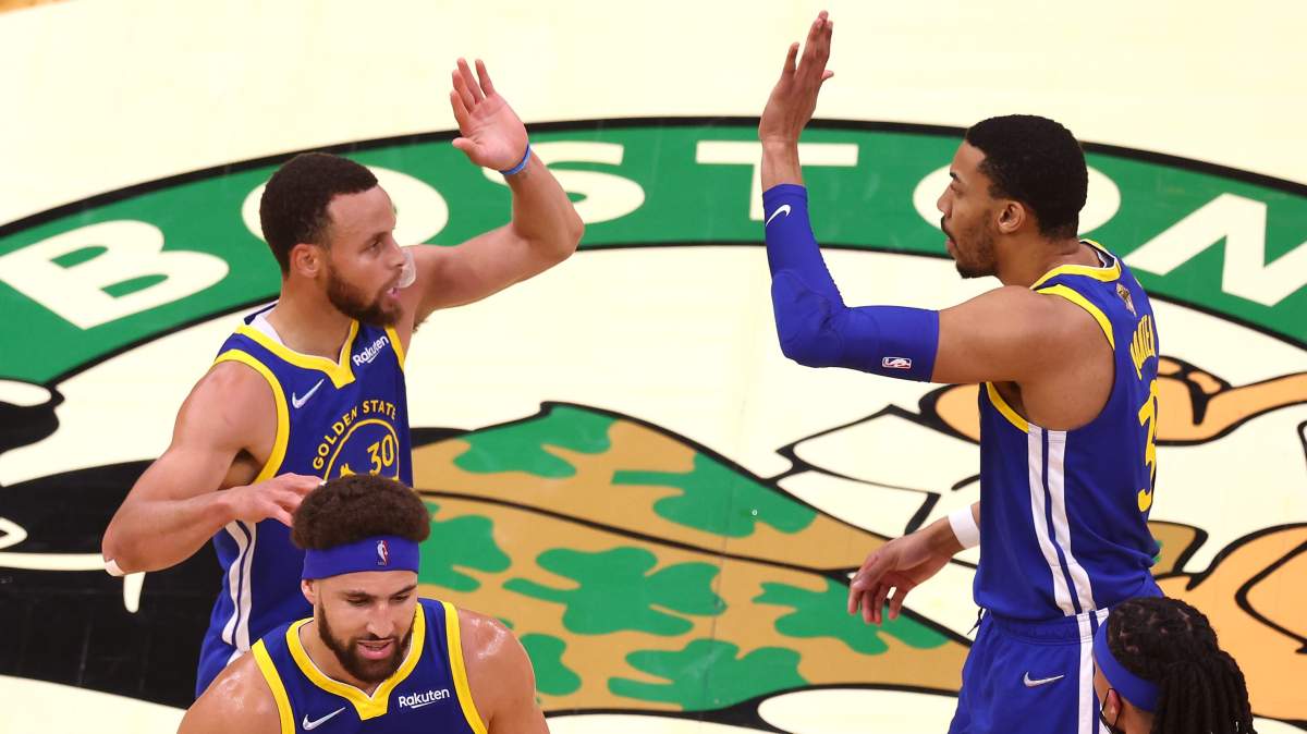 GettyOtto Porter Jr. (right) and Gary Payton II (left) help Steph Curry up during an NBA Finals game between the Golden State Warriors and the Boston Celtics.