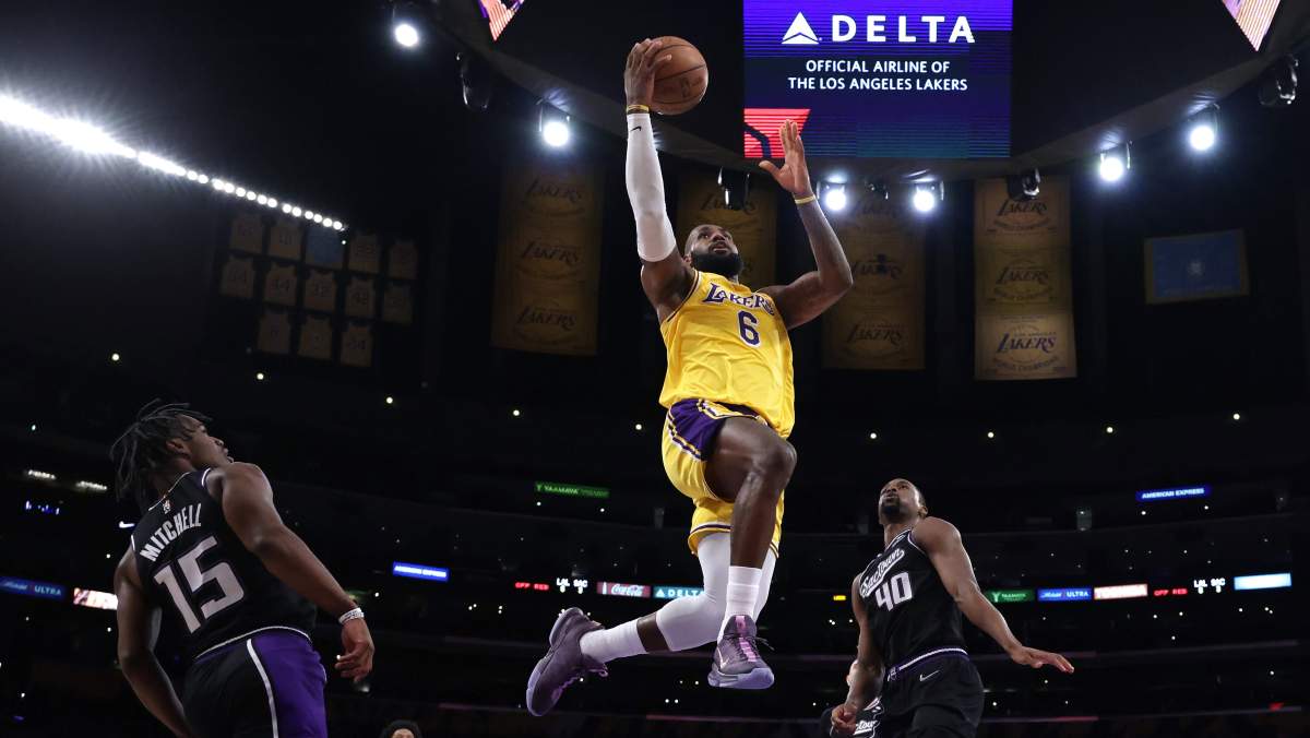 With 52 seconds to play in the game, James drove hard to the rim and drew a foul on Kings center (and former teammate) Damian Jones, making the layup in the process and putting L.A. up by six points (he missed the free throw).