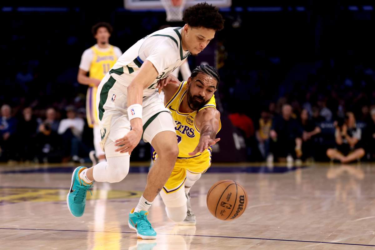 Getty Ryan Rollins of the Milwaukee Bucks drives to the basket against Markieff Morris of the Los Angeles Lakers.