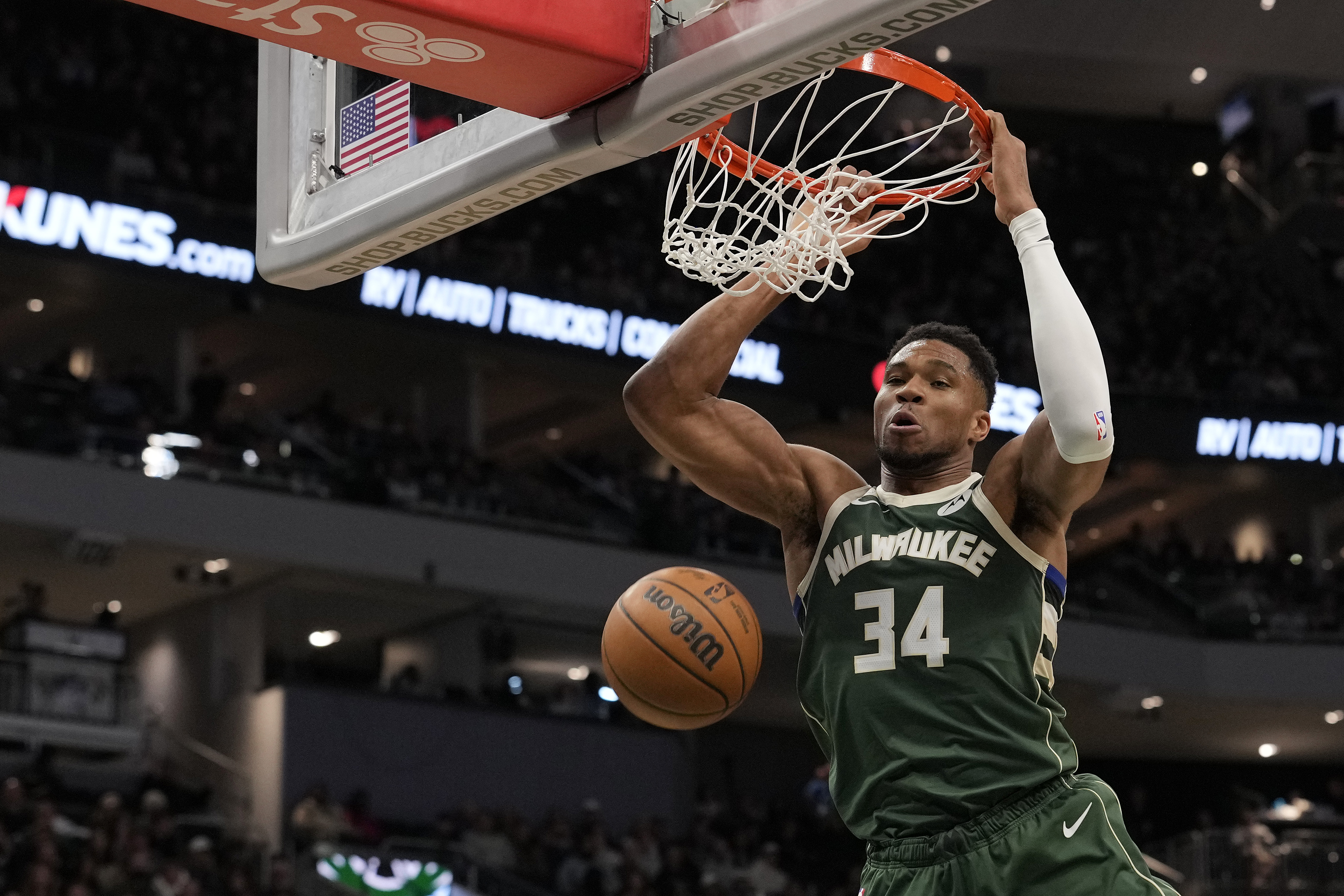 GettyMILWAUKEE, WISCONSIN – OCTOBER 22: Giannis Antetokounmpo #34 of the Milwaukee Bucks dunks the ball against the Washington Wizards during the second quarter at Fiserv Forum on October 22, 2025 in Milwaukee, Wisconsin. (Photo by Patrick McDermott/Getty Images)