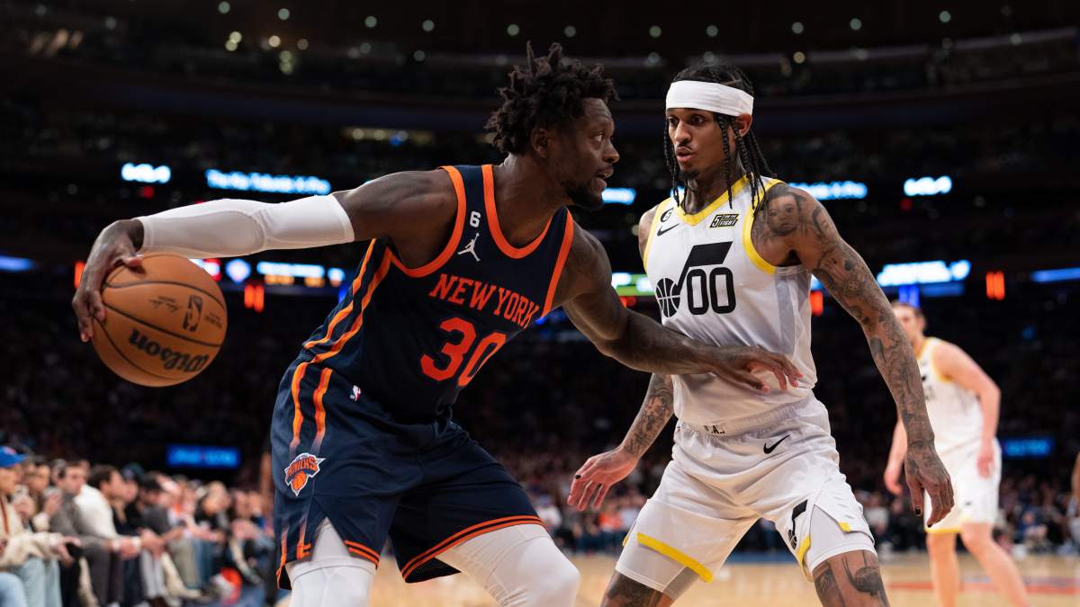 Julius Randle of the New York Knicks being guarded by Jordan Clarkson.