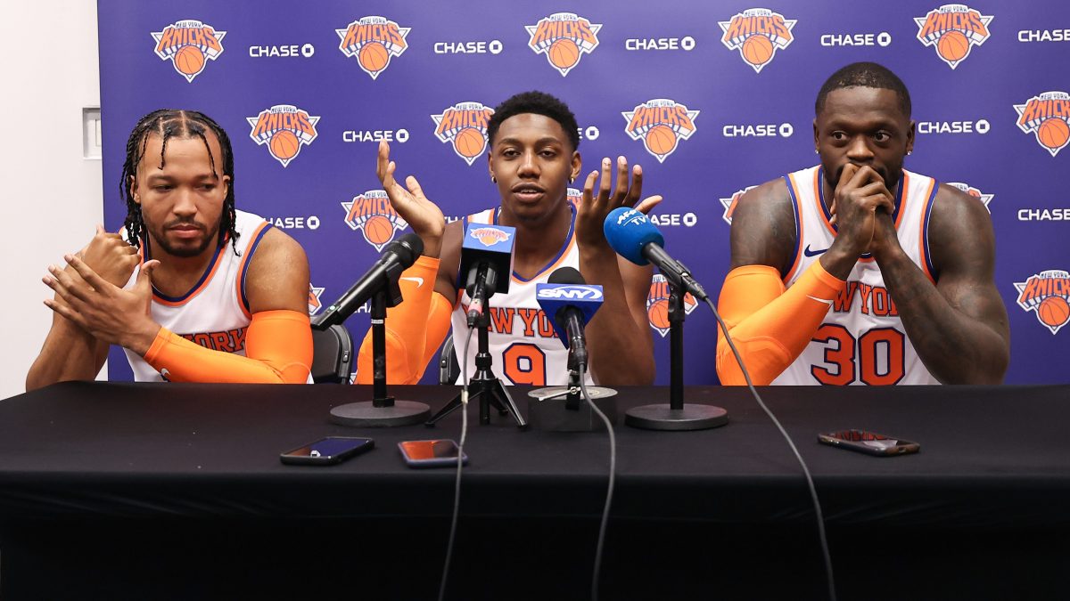 Jalen Brunson #11, RJ Barrett #9, and Julius Randle #30 speak at a press conference during media day.