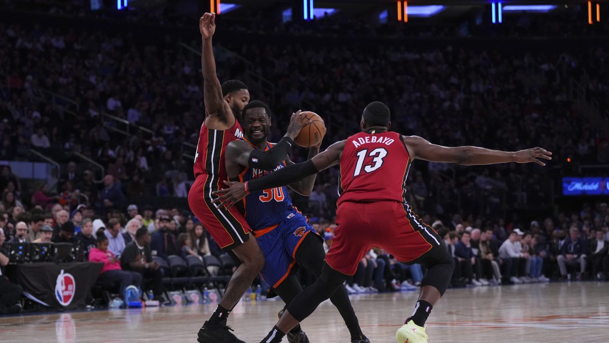 Julius Randle #30 of the New York Knicks drives to the basket against Haywood Highsmith #24 and Bam Adebayo #13 of the Miami Heat.