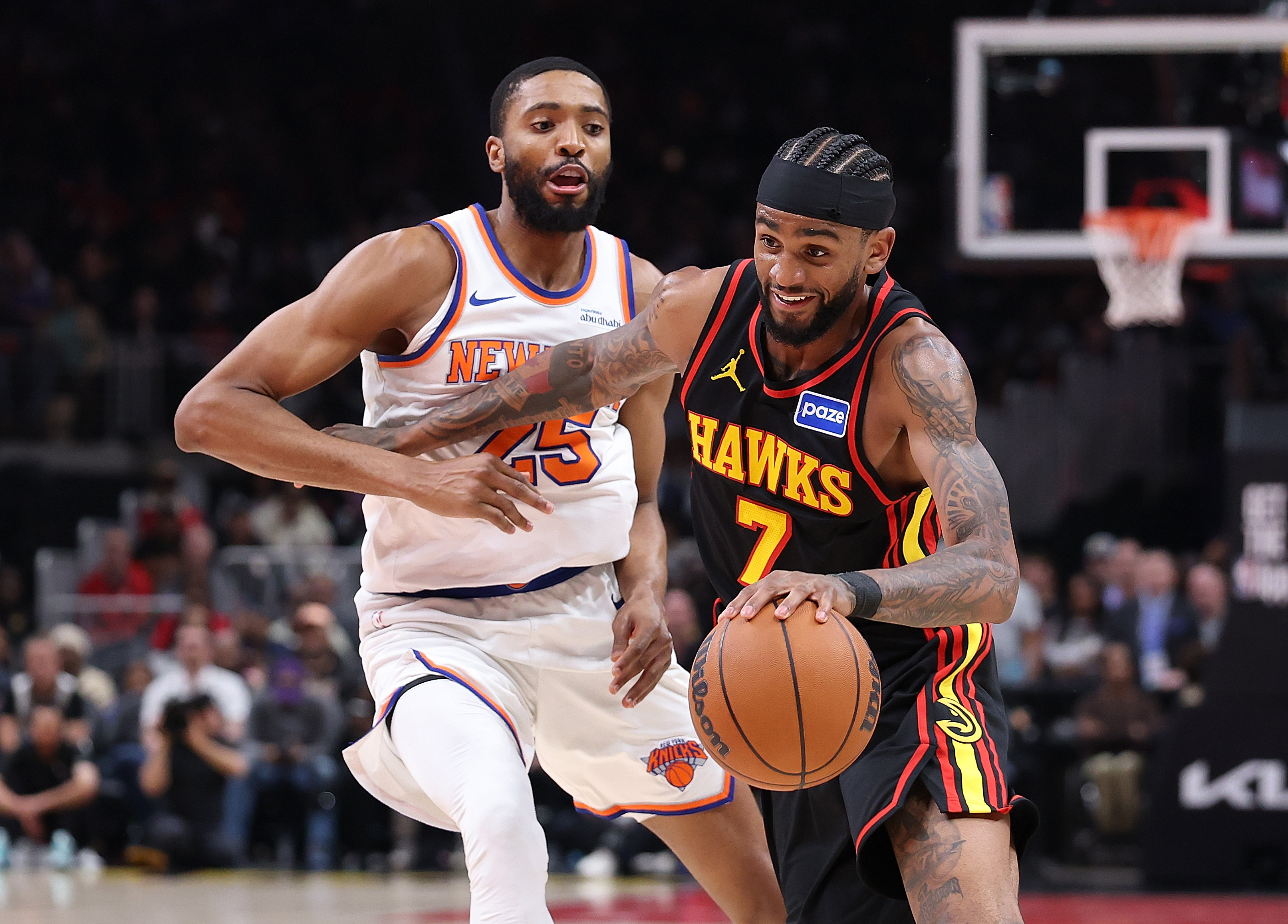 GettyNickeil Alexander-Walker #7 of the Atlanta Hawks drives against Mikal Bridges #25 of the New York Knicks during the third quarter at State Farm Arena on April 06, 2026 in Atlanta, Georgia.
