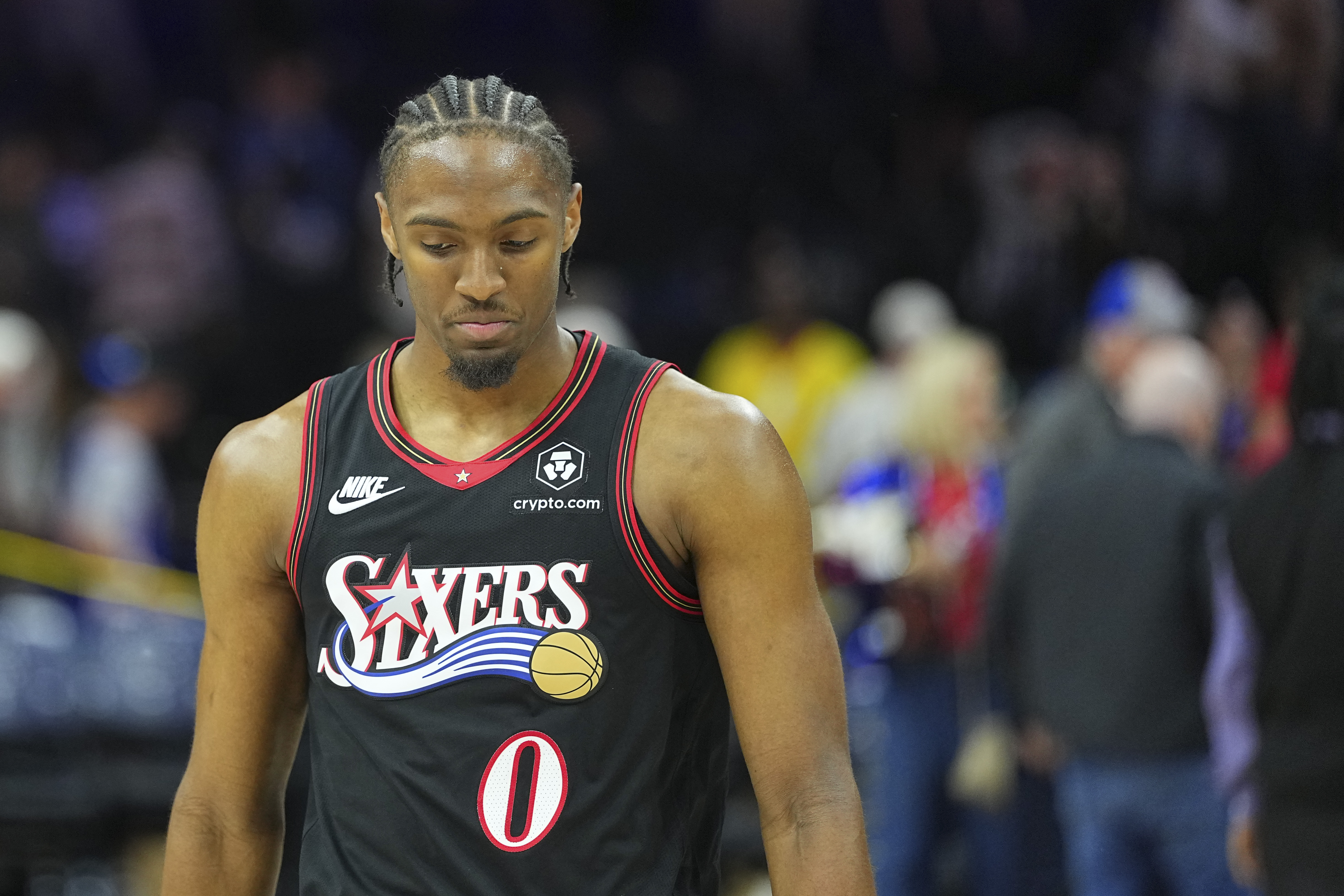 GettyTyrese Maxey #0 of the Philadelphia 76ers walks off the court after the game against the Boston Celtics during game three of the Eastern Conference first round playoffs at Xfinity Mobile Arena on April 24, 2026 in Philadelphia, Pennsylvania. The Celtics defeated the 76ers 108-100.