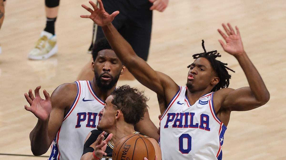Sixers teammates Joel Embiid and Tyrese Maxey trap Hawks star Trae Young in a 2021 game.