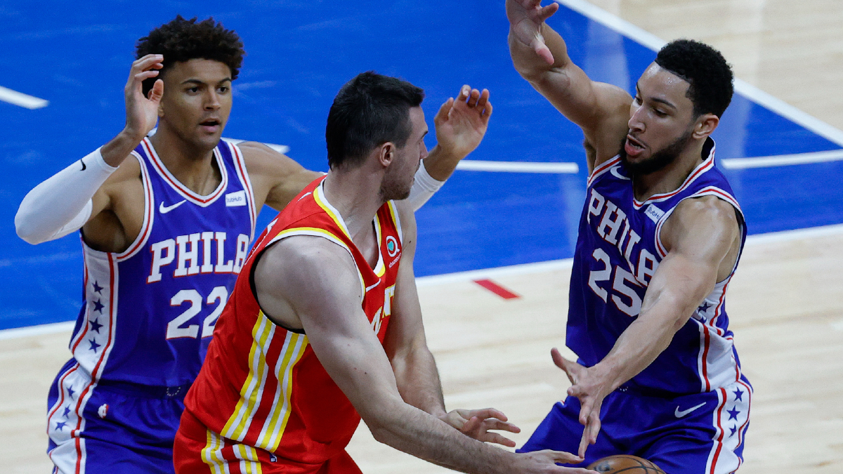 Ben Simmons and Matisse Thybulle of the Philadelphia defend Danilo Gallinari during a playoff game against the Atlanta Hawks.