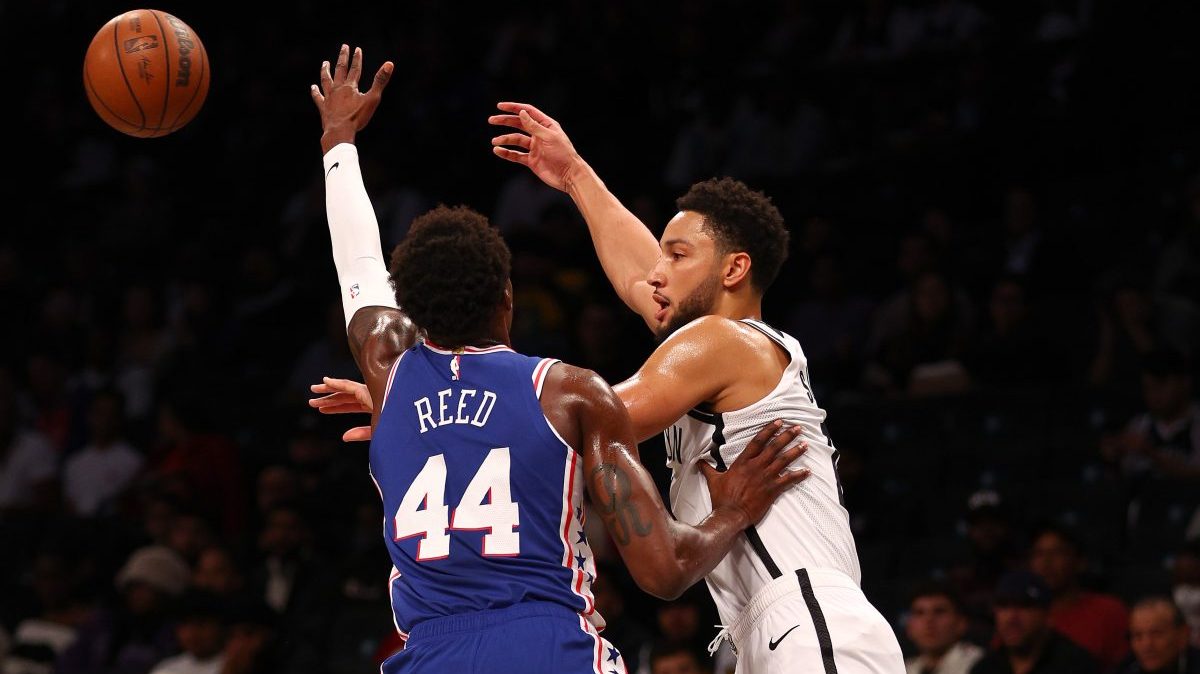 Ben Simmons #10 of the Brooklyn Nets passes the ball as Paul Reed #44 of the Philadelphia 76ers defends in the first half during a preseason game at Barclays Center on October 03, 2022 in the Brooklyn borough of New York City.
