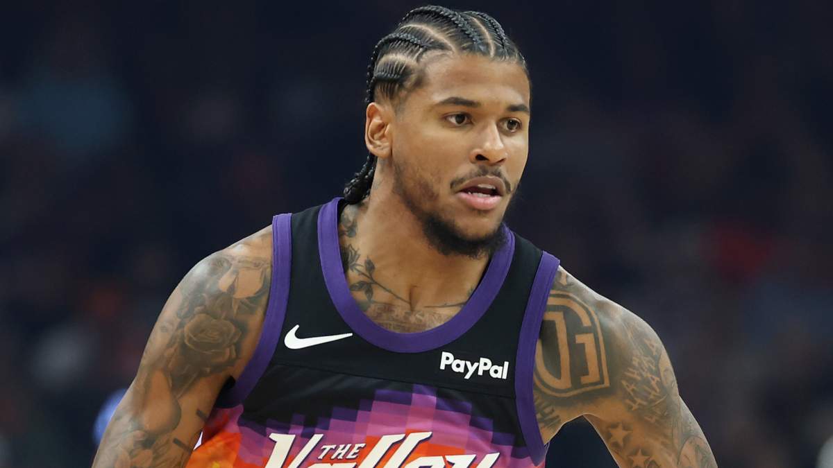 GettyJalen Green #4 of the Phoenix Suns reacts to a slam dunk against the Portland Trail Blazers during the second half of an NBA play-in tournament game at Mortgage Matchup Center on April 14, 2026 in Phoenix, Arizona.