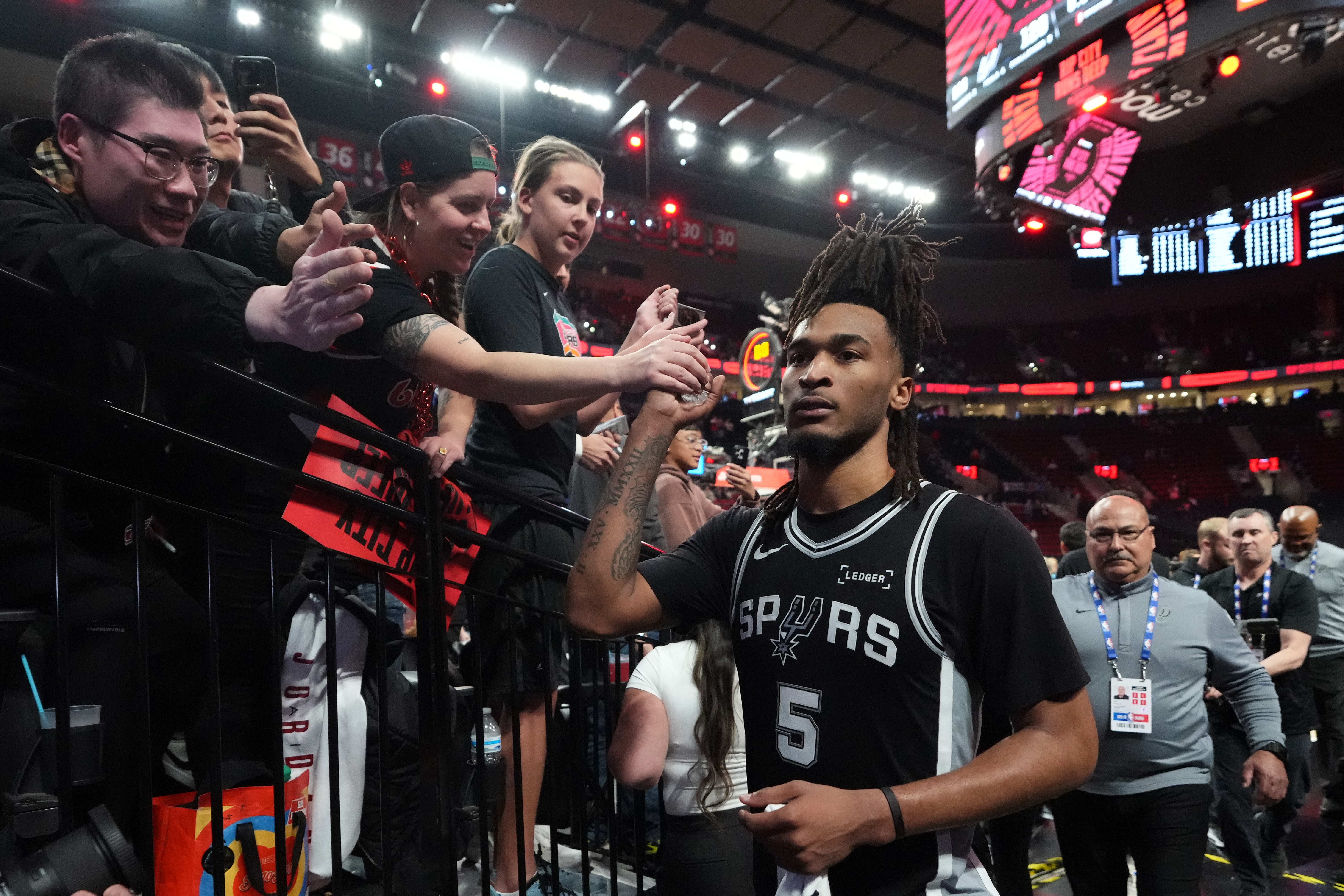 GettyStephon Castle #5 of the San Antonio Spurs greets fans as he walks off the court after Game Three of the Western Conference First Round Playoffs against the Portland Trail Blazers at Moda Center on April 24, 2026 in Portland, Oregon.