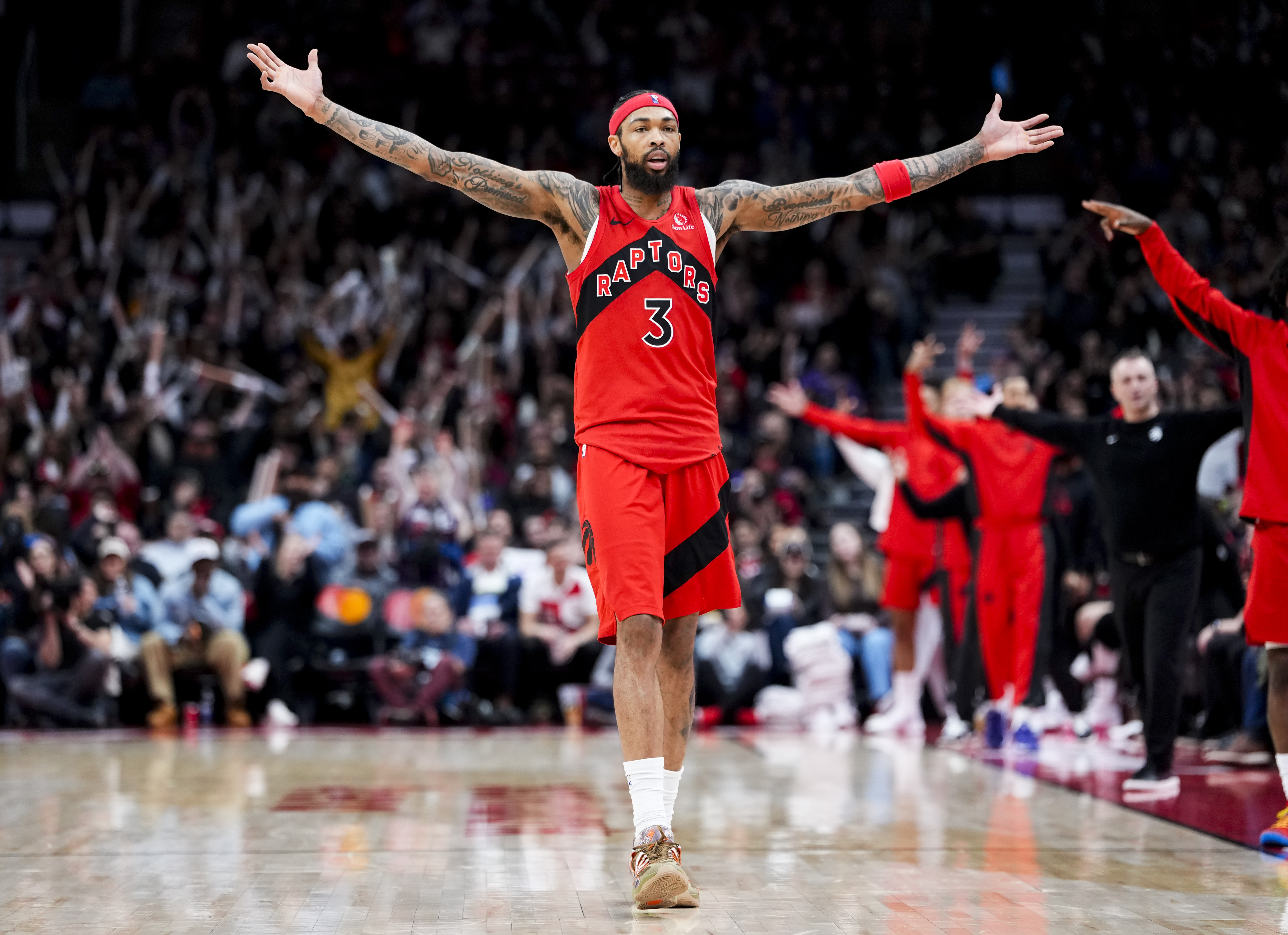 GettyBrandon Ingram #3 of the Toronto Raptors celebrates a three-point basket against the Cleveland Cavaliers with teammates Scottie Barnes #4 and Jamal Shead #23 during second half action at Scotiabank Arena on November 24, 2025 in Toronto, Ontario, Canada.