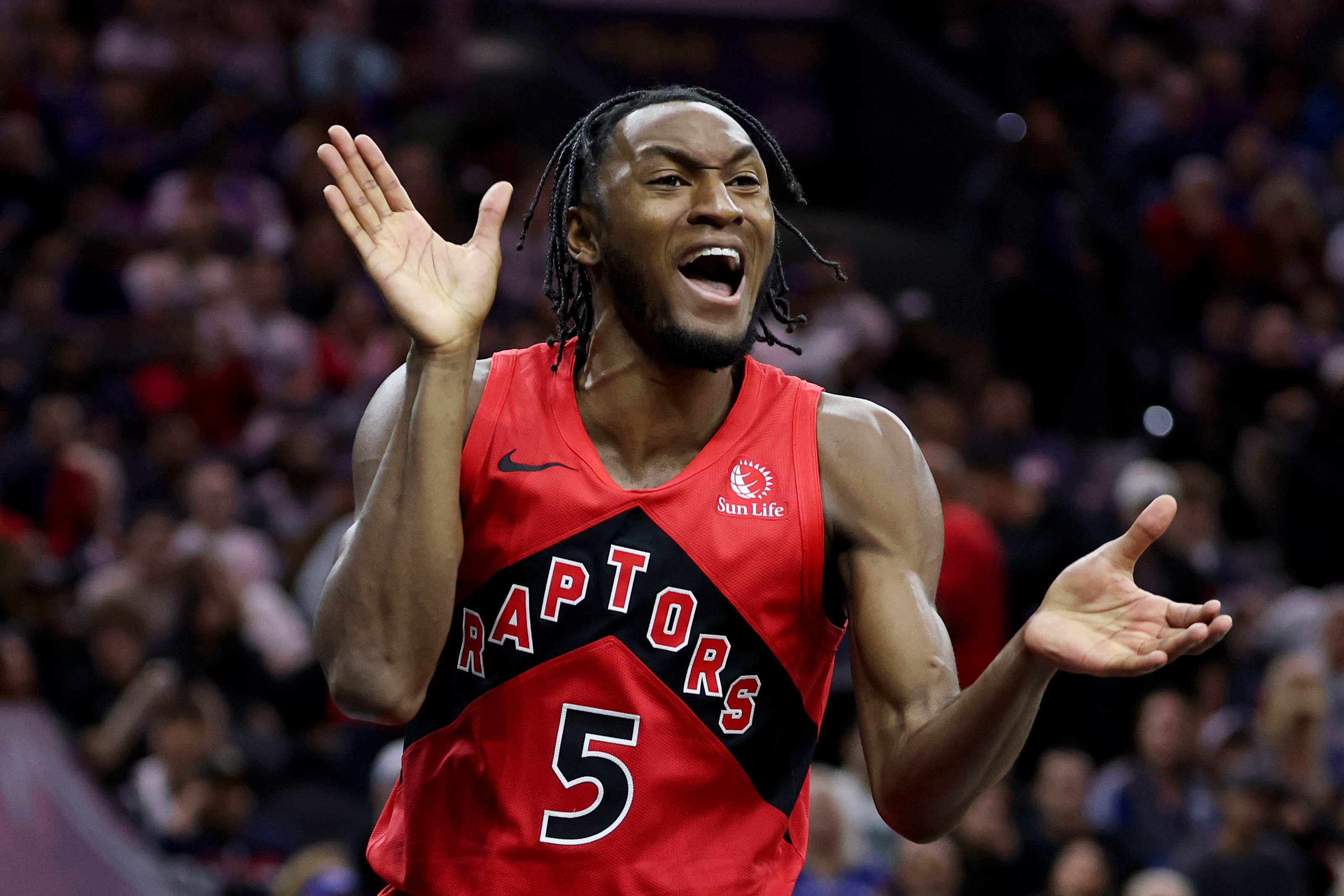 GettyImmanuel Quickley #5 of the Toronto Raptors reacts to a call by the official during the first half against the Philadelphia 76ers at Xfinity Mobile Arena on November 08, 2025 in Philadelphia, Pennsylvania.