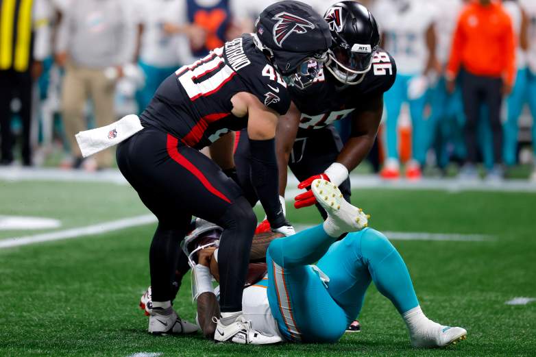GettyATLANTA, GEORGIA – OCTOBER 26: JD Bertrand #40 and Ruke Orhorhoro #98 of the Atlanta Falcons sack Tua Tagovailoa #1 of the Miami Dolphins during the first quarter in the game at Mercedes-Benz Stadium on October 26, 2025 in Atlanta, Georgia. (Photo by Todd Kirkland/Getty Images)