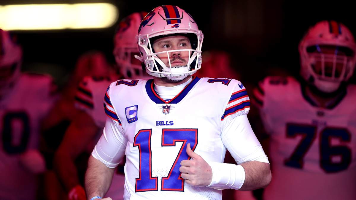 Josh Allen jogs onto the field before a playoff game against the Kansas City Chiefs.