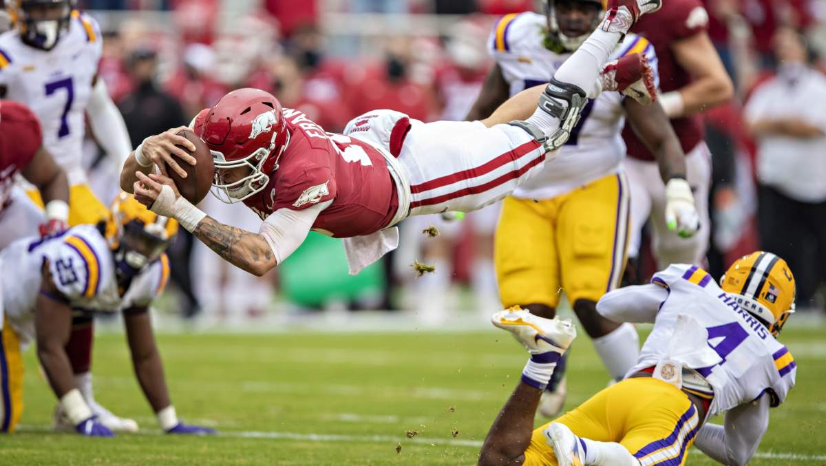 “Multiple swings at quarterback. Why not?,” Hoge wrote. “Franks has outstanding size and has good footwork to elude rushers and reset before throwing him. His operation is smooth, and he uncorks some beautiful deep balls. He’s not great off-platform and needs to be more consistent, but there could be some untapped upside left. Franks’ NFL hopes were on life support after getting hurt at Florida in 2019, but he showed a lot of improvement at Arkansas in less than ideal circumstances. He’s worth a flyer with the last pick in the sixth round.”