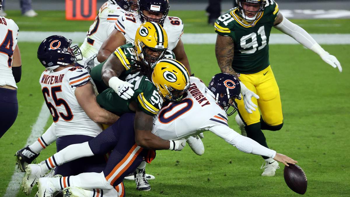 GettyMitchell Trubisky of the Chicago Bears fumbles the ball as he is hit by Za’Darius Smith of the Green Bay Packers during the 1st half of the game at Lambeau Field on November 29, 2020 in Green Bay, Wisconsin. (Photo by Dylan Buell/Getty Images)