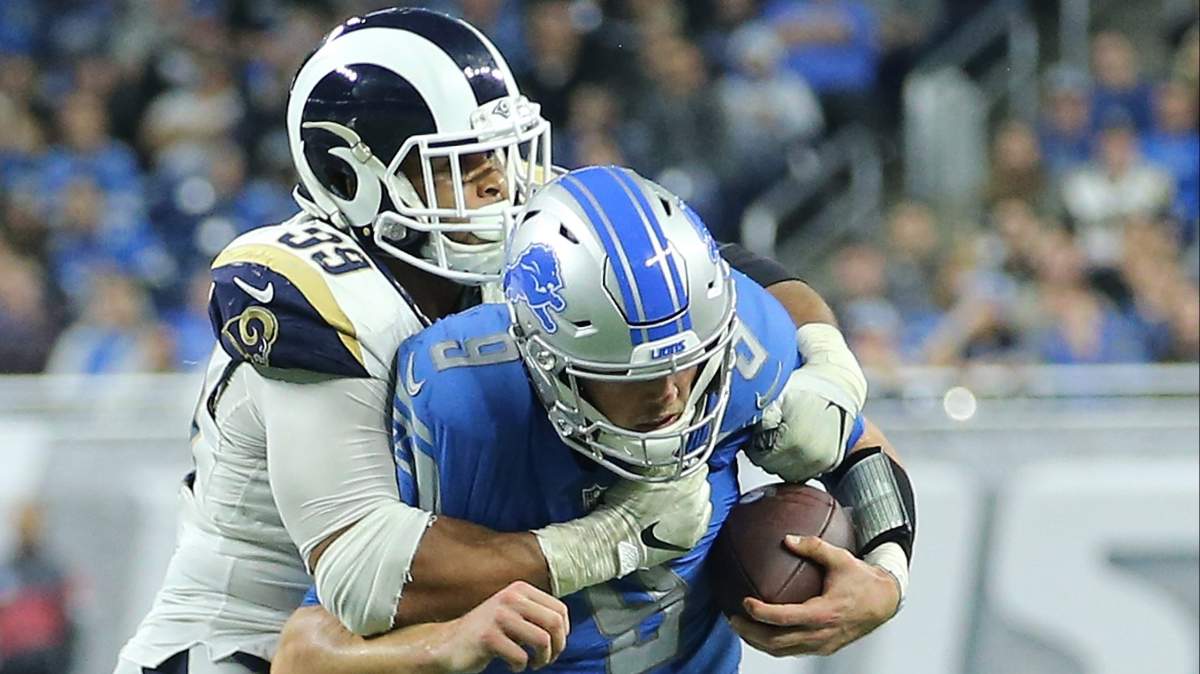 Aaron Donald sacks Matthew Stafford in 2018.