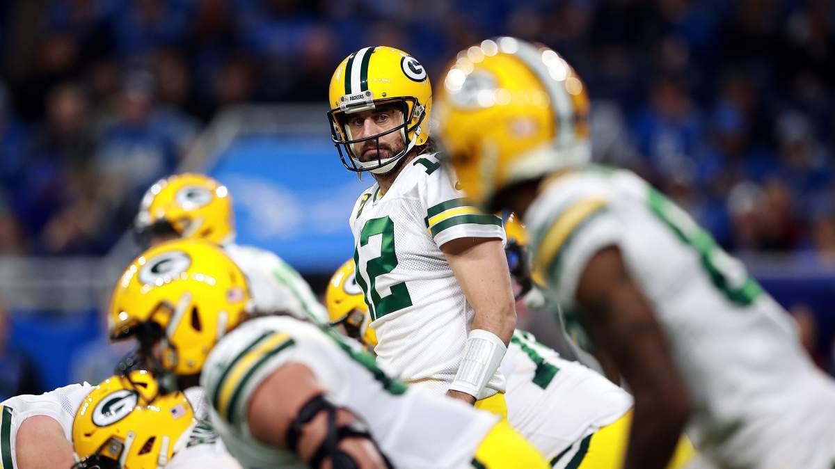 GettyQuarterback Aaron Rodgers of the Green Bay Packers reacts against the Detroit Lions during the second quarter at Ford Field on January 9, 2022 in Detroit, Michigan. (Photo by Rey Del Rio/Getty Images)