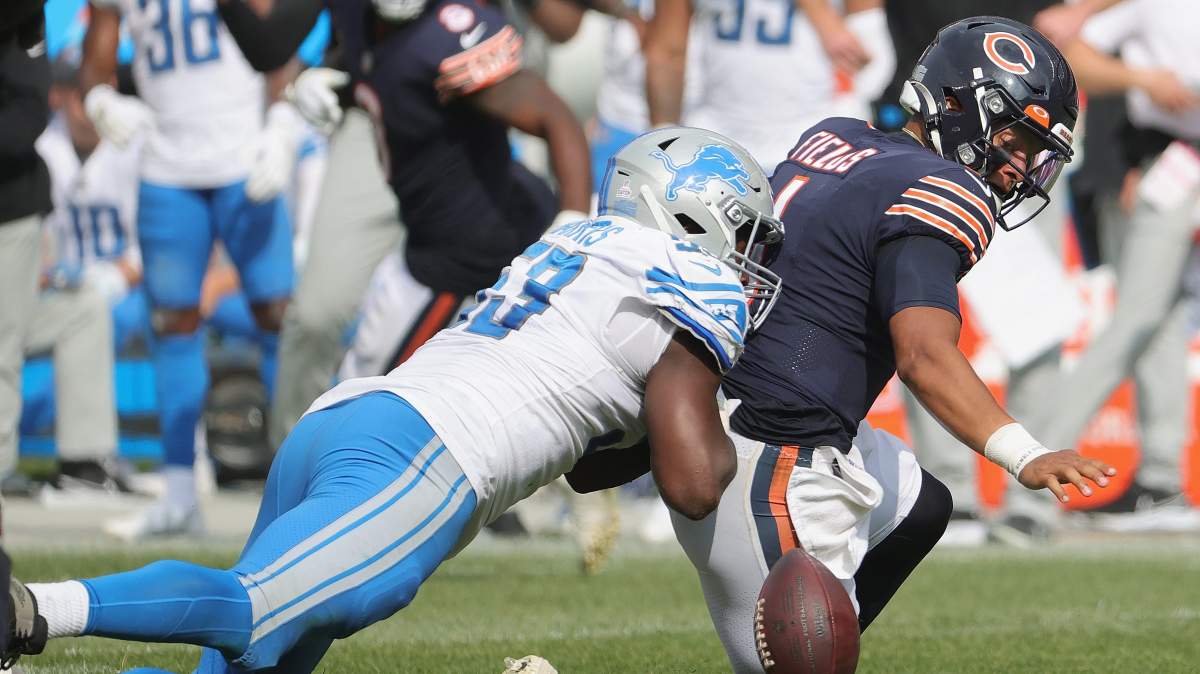 Detroit Lions edge rusher Charles Harris strips Chicago Bears quarterback Justin Fields on October 3, 2021.