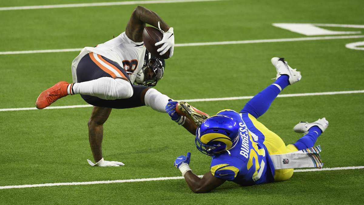 On the night of October 26, 2020, Burgess was putting together his best evening to date as an L.A. Ram. The 5-foot-11, 202-pound rookie from the University of Utah snatched four Chicago Bears for solo tackles, including snuffing this short screen out against a taller 6-foot-2, 220-pound Cordarrelle Patterson.