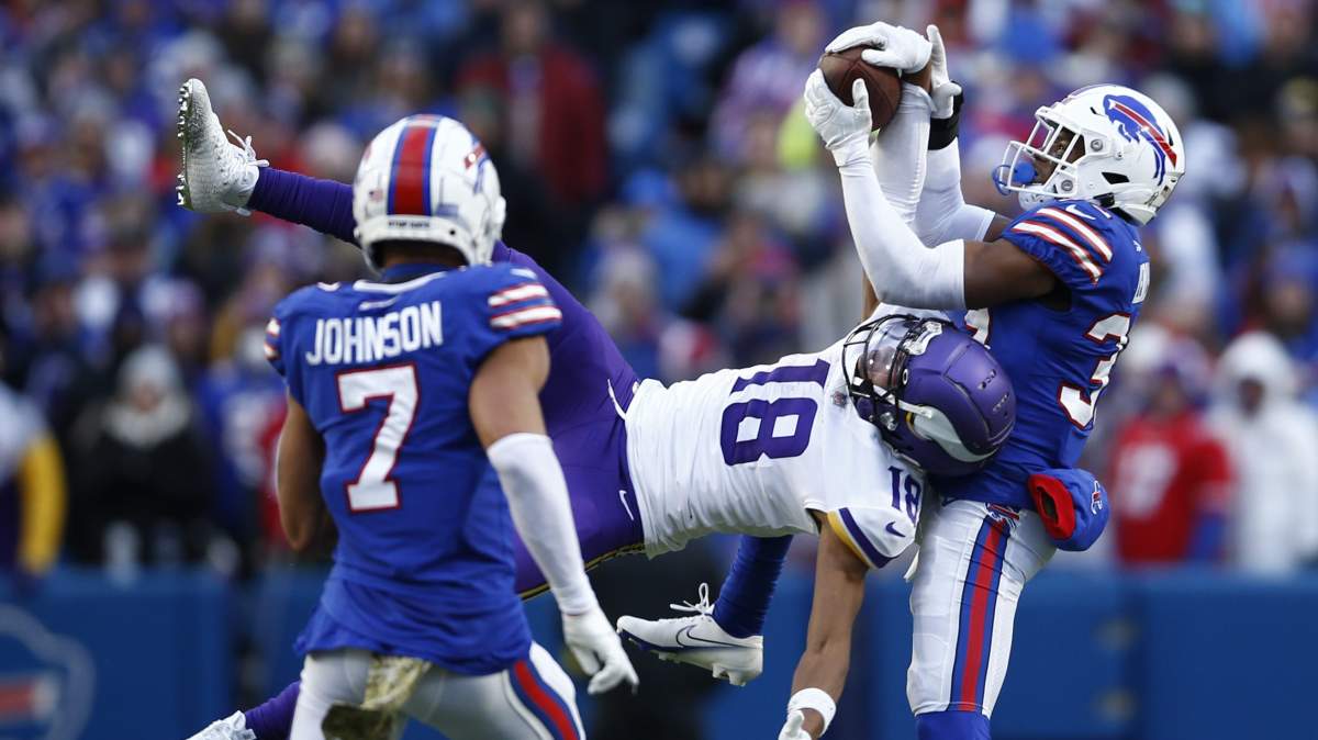 GettyWR Justin Jefferson of the Minnesota Vikings catches a touchdown over DB Dane Jackson of the Buffalo Bills during the first quarter of a game at Highmark Stadium on November 13, 2022 in Orchard Park, New York. (Photo by Timothy T Ludwig/Getty Images)