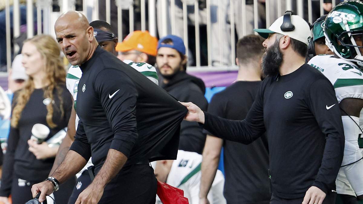 New York Jets head coach Robert Saleh strongly reacting in the middle of an NFL game.