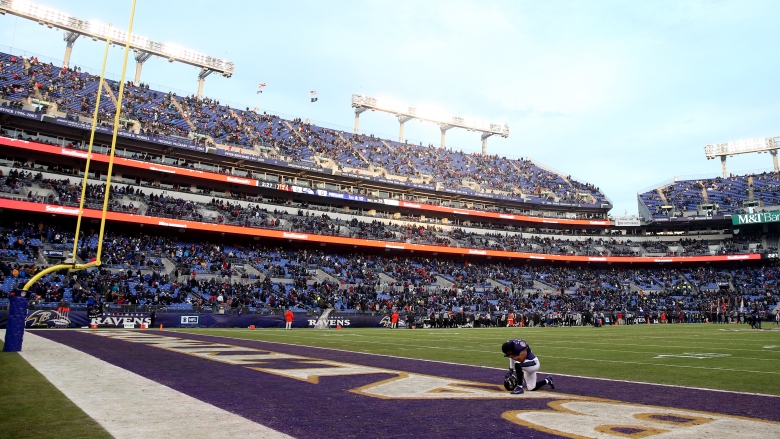 The team has also tweaked the painted lettering in one end zone. As usual it will spell out “BALTIMORE.” But instead of all-white lettering with a gold outline, the “M-O” in “BALTIMORE” will be gold, “so everybody can see it and everybody knows that he’s going to be out here with us,” said Darney.