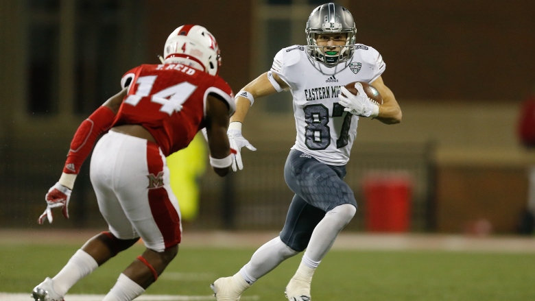As such, Sexton has been referred to as a “speedy, scrappy special teams player who can also play WR.” Naturally, he did both at Eastern Michigan, where he caught a total of 100 passes for 1,335 yards and nine touchdowns. He also returned 21 kickoffs for 353 yards and two punts for 77 yards and a touchdown while also demonstrating a penchant for blocking kicks.