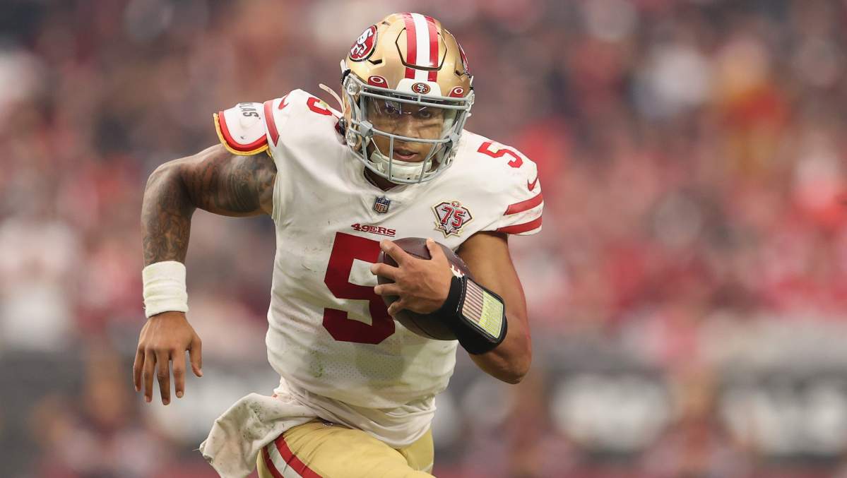Trey Lance runs the ball during his first NFL start against the Arizona Cardinals.