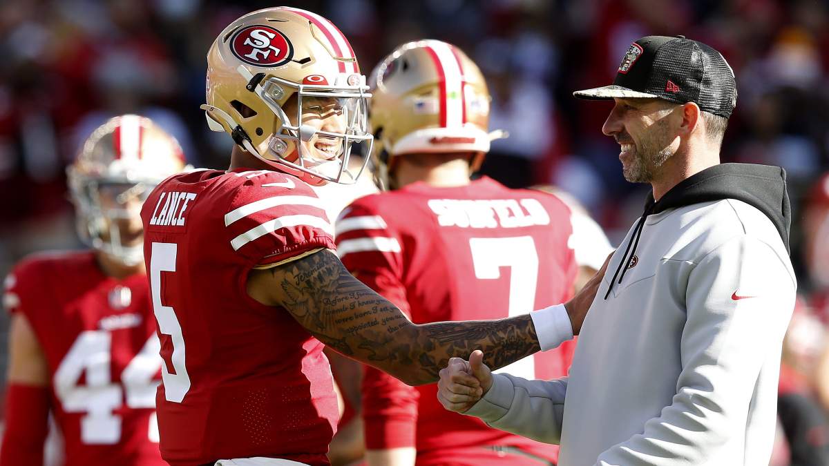 Trey Lance and 49ers head coach Kyle Shanahan shares a laugh during the Week 17 contest versus the Texans.