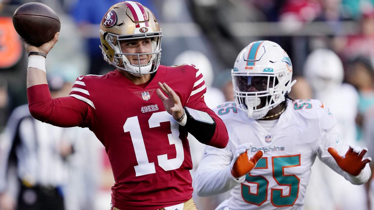 Brett Kollmann of “The Film Room” captured this clip involving Purdy facing a third and 10 scenario. The Dolphins lined up with three back and eight crowding the line of scrimmage. Linebacker Jaelan Phillips applies the heat as the free rusher. But Kollman shares why, as he said, it’s “easy to see why Kyle likes him so much.”