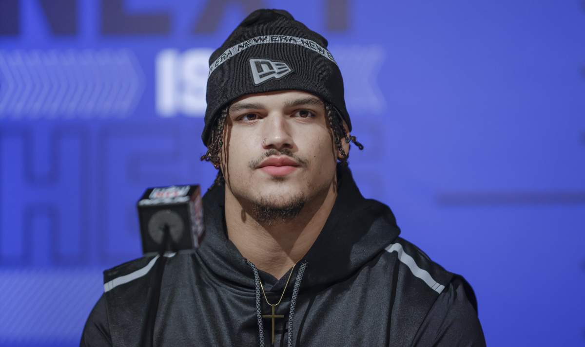 Logan Hall of Houston talks to reporters during the 2022 NFL combine. Hall is considered a potential fit for the 49ers.