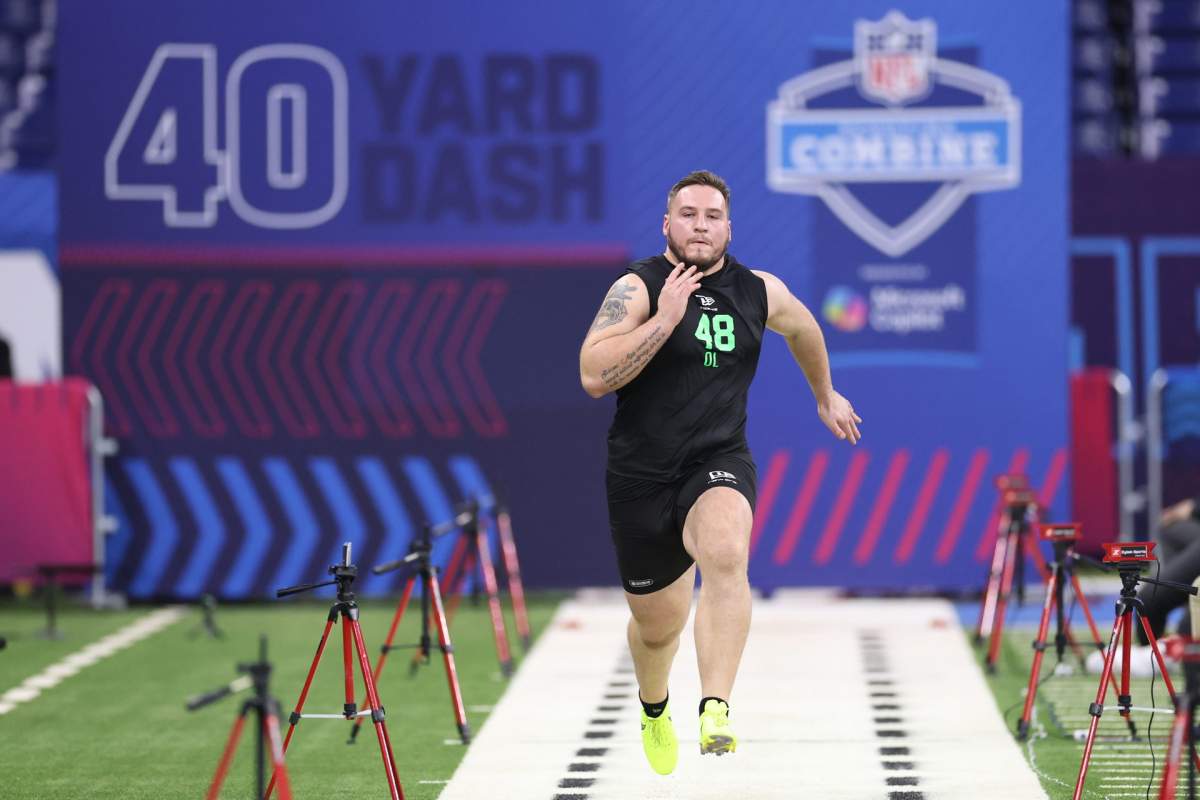 He is just above 6’5” and weighs between 313 and 315 lbs, which is a great height and weight for an offensive lineman. His speed scores were just okay after running a 5.35 40 yard dash, 3.06 20 yard split, and 1.82 10 yard split. His explosion scores were good after having a 28” vertical jump and 8’6” broad jump. Also, his agility scores were decent as well with an excellent 7.6 second three cone drill. That being said, his shuttle cone was poor after posting a 4.85 second shuttle cone.