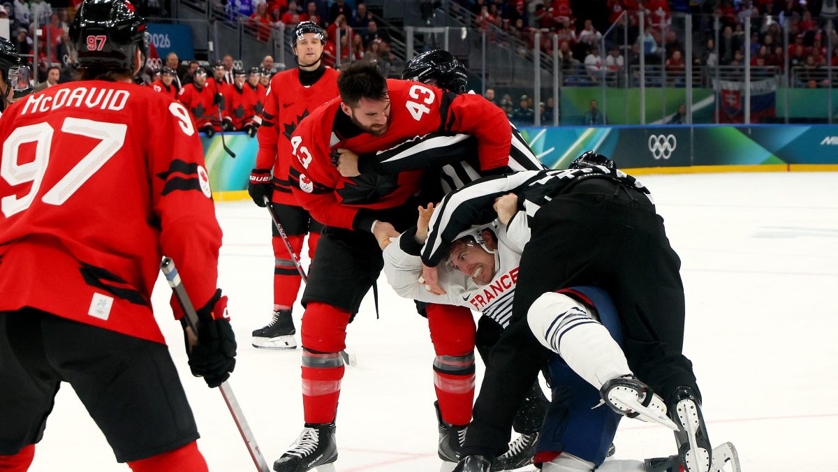 During Team Canada’s 10-2 blowout win over France on Sunday, forward Tom Wilson fought Pierre Crinon during the third period. Crinon hit Team Canada star forward Nathan MacKinnon in the head, which Wilson took exception to while he was on the bench.