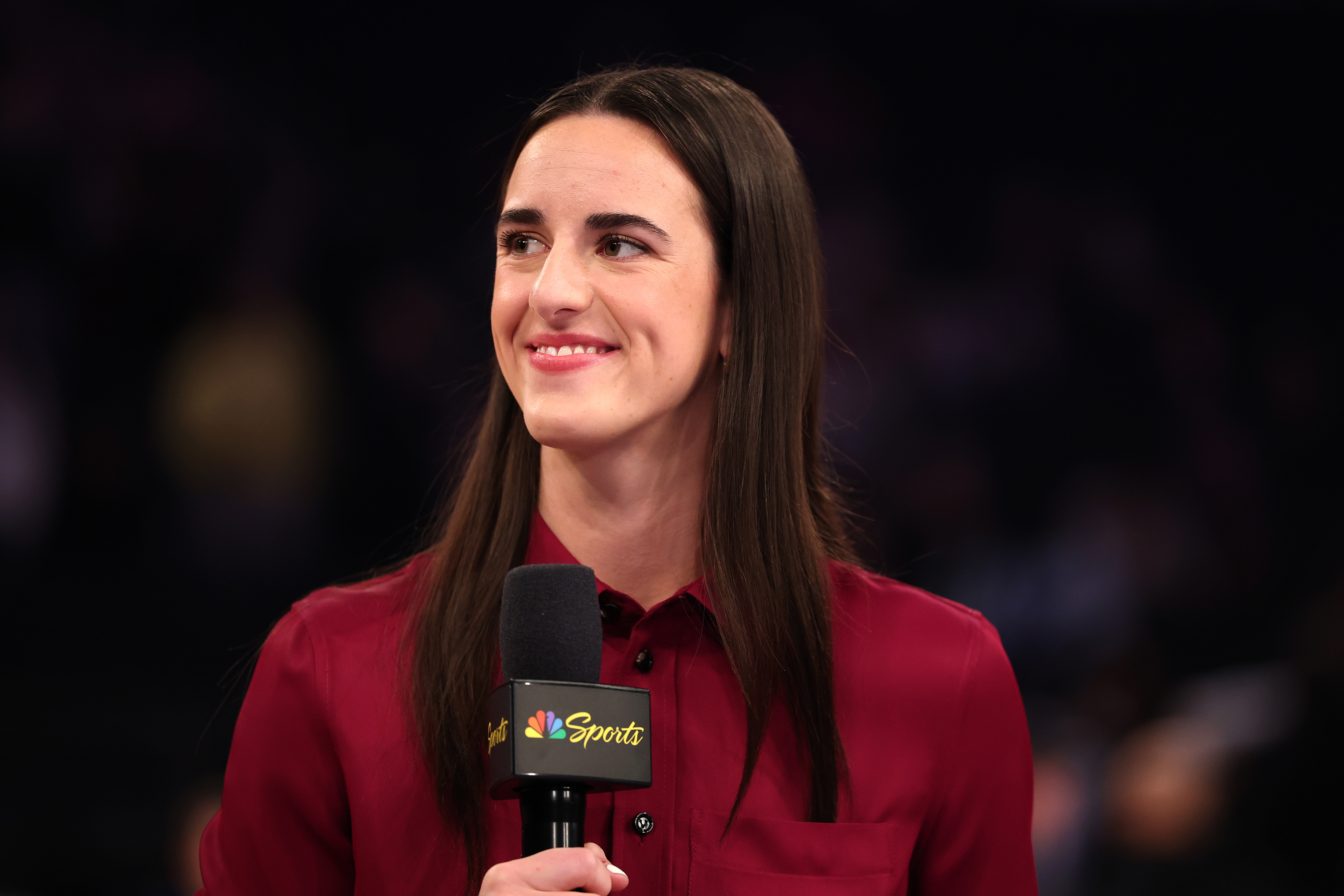 GettyCaitlin Clark talks on stage as she joins NBC’s Sunday Night Basketball prior to the game between the Los Angeles Lakers and New York Knicks at Madison Square Garden on February 01, 2026 in New York City.